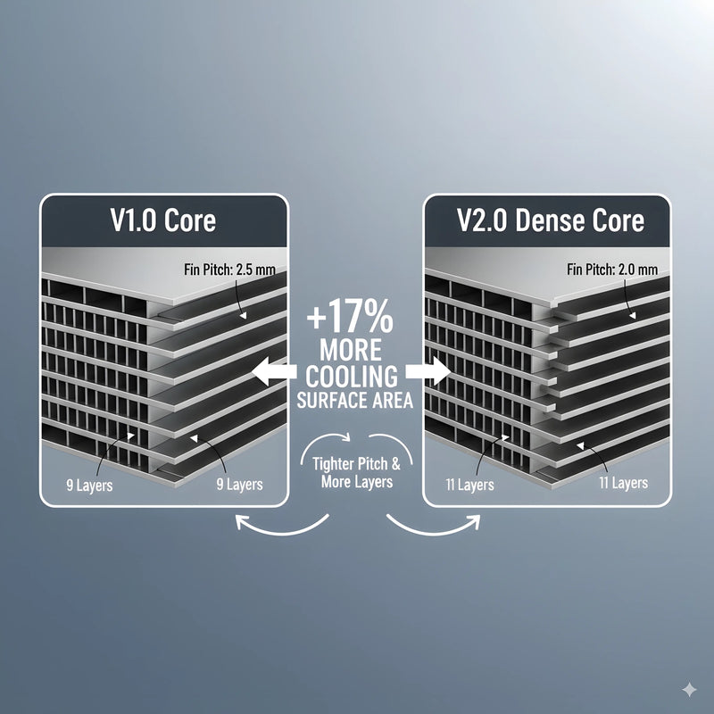 The new Elantra N V2.0 intercooler features a denser bar and plate core than our previous design, increasing the internal fin surface area. This design improves heat transfer, drops intake air temperatures faster, and resists heat soak more effectively, giving you consistent power through repeated pulls.